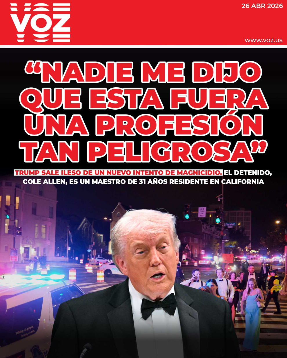 Por el hecho, las autoridades arrestaron a un sospechoso identificado como Cole Allen, un maestro de 31 años residente en California. Es acusado de dos cargos: uso de un arma de fuego durante la comisión de un delito violento y agresión a un agente federal con arma peligrosa.