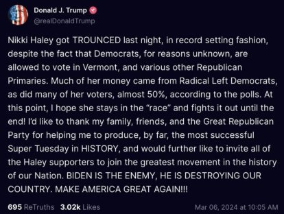 Trump took the opportunity to remind everyone that Haley performed better in those states where Democrats and independents could vote in the Republican primaries.