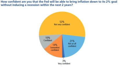 A survey by The National Association of Business Economists found that 73% of economists are not very, or not at all, confident that the Federal Reserve (Fed) can bring inflation down to its 2% target over the next two years without causing even more economic attrition. Only 3% of economists say they are very confident that the Fed will succeed in reducing inflation without further hurting people's pockets. 14% are somewhat confident and 10% are confident.
