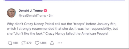 These statements were ratified by Trump himself with several posts on Truth Social. In one, he questions "Crazy Nancy Pelosi['s]" decision not to call out the National Guard and concludes that "Crazy Nancy failed the American people."