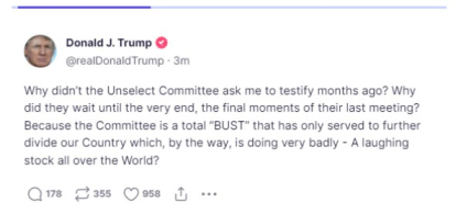 In another post on Truth Social, the former president was very critical of the investigative committee.