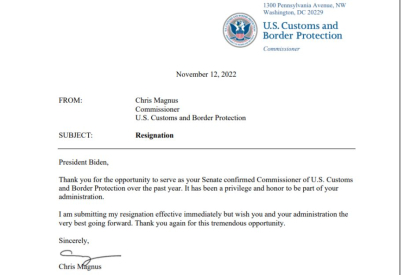 Less than 24 hours after claiming he would not resign, the White House released the resignation letter of Chris Magnus, Commissioner of Customs and Border Protection. Also President Joe Biden's acceptance and thank you missive. Magnus denounced pressure from Homeland Security Secretary Alejandro Mayorkas to leave office the day before the midterms.