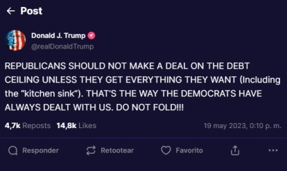 Donald Trump jumped head first into the now-paused debt ceiling negotiations. After hearing the news about the pause in talks between Democrats and Republicans, the former president was quick to comment on the matter through his own social network, Truth Social.