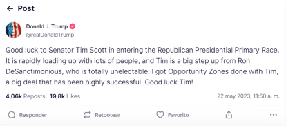 “Good luck to Senator Tim Scott in entering the Republican Presidential Primary Race. It is rapidly loading up with lots of people, and Tim is a big step up from Ron DeSanctimonious, who is totally unelectable. I got Opportunity Zones done with Tim, a big deal that has been highly successful. Good luck Tim!” the former president wrote on his Truth Social account.