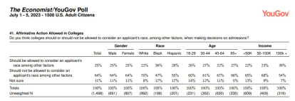 However, The Economist/YouGov poll found a striking fact: African-Americans favor the Supreme Court ruling. Indeed, 47% of African Americans surveyed said that “the race of the applicant should not be allowed to be taken into account among other factors,” which contrasted with 36% who were in favor and 17% who do not yet have an opinion on the matter.