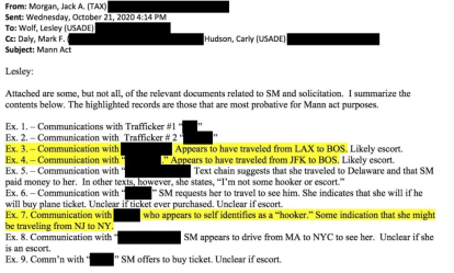 According to IRS tax crimes prosecutor Jack Morgan, Hunter Biden paid money to several escorts to travel from Boston and New York to Los Angeles, according to an email sent on Oct. 21, 2020, to Assistant U.S. Attorney Lesley Wolf, accused of torpedoing federal investigations against the Biden family.