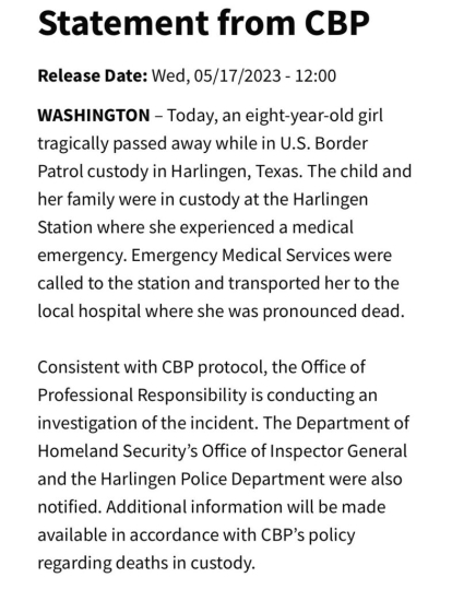 The statement from CBP, the Border Patrol's parent agency, did not disclose the girl's nationality or provide additional information about the incident. As The L.A. Times notes, this is the first death of a minor in Border Patrol custody since 2019. Other minors have died recently while in Department of Health and Human Services (HHS) custody, the latest occurrence being a 17-year-old Honduran boy who died last week.